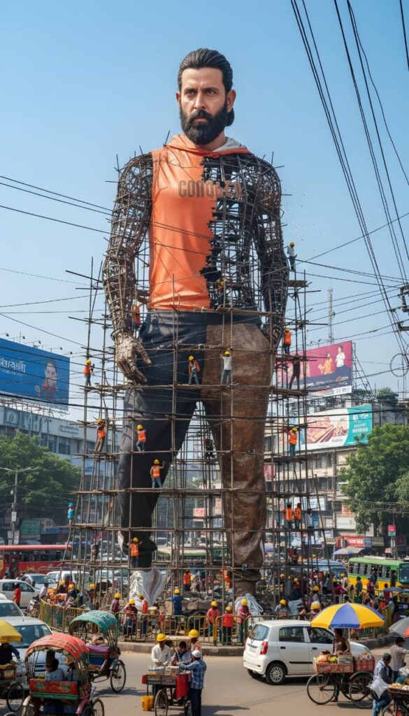 Create a giant hyper-realistic statue based on the given photo, keeping the original face exactly the same without changes. The statue stands tall in the middle of a roundabout in Dhaka, near a famous historical landmark. The statue is still under construction, surrounded by scaffolding, with many construction workers in yellow helmets and orange vests climbing, welding, and working on it. Parts of the statue’s body are still exposed metal framework, while other sections are already detailed and finished.
