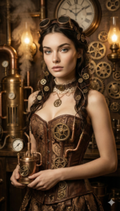 “Transform this photo into a richly detailed steampunk setting: brass and copper mechanical elements, Victorian-era clothing with modern twists, steam-powered devices in the background, warm sepia lighting, and stylized gears or clockwork embedded in the environment.”