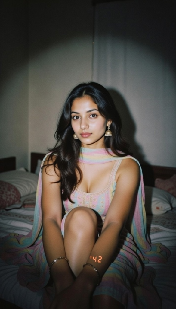 OUTFIT & ACCESSORIES·Soft pastel ethnic top with subtle embroidery· Matching dupatta loosely draped· Jhumkas·Minimal bangles· Hair slightly tangled, natural bedroom look FLASH& LIGHTING· Strong direct flashfrom camera· Face brightly illuminated Background falls into darkness·Harsh shadows on bedding and wall Heavy vignette