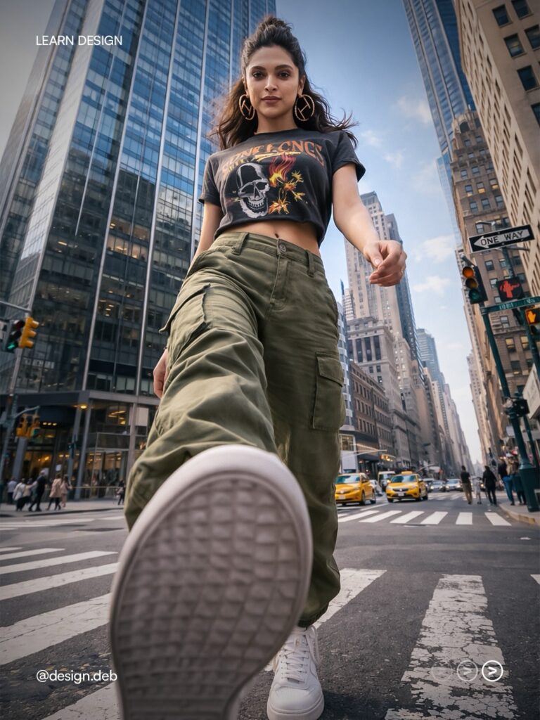 “Create a hyper-realistic, high-resolution fashion photo using a dramatic low-angle perspective. A young woman (using the 100% real face and hair from the provided reference image) is walking confidently across a city intersection, viewed from ground level so her sneakered foot appears oversized in the foreground. She is wearing olive green cargo pants, white sneakers, and a cropped graphic T-shirt. The setting is a modern city street with tall glass skyscrapers, classic buildings, traffic lights, street signs, yellow taxis, and pedestrians below, creating a miniature city effect. The sky is bright blue with natural daylight, giving the scene a clean, vibrant look. Use wide-angle lens distortion, sharp focus, realistic proportions cinematic lighting, and a bold urban fashion editorial style. The overall mood should feel powerful, playful, and modern, like a high-end streetwear campaign. Render in ultra 8k clarity with